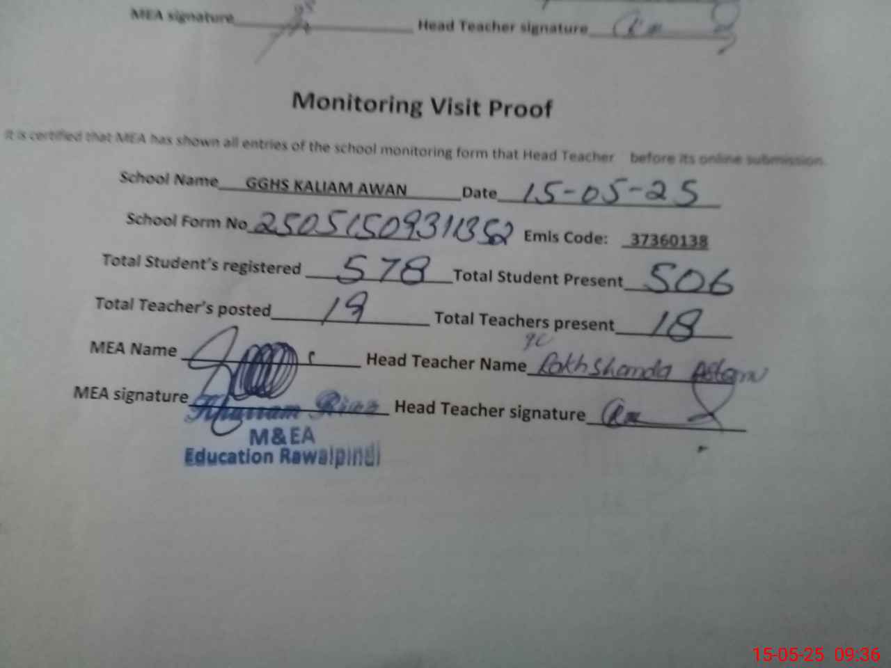 | Attendance Register | Head Teacher | MEA with School | Visit Proof |