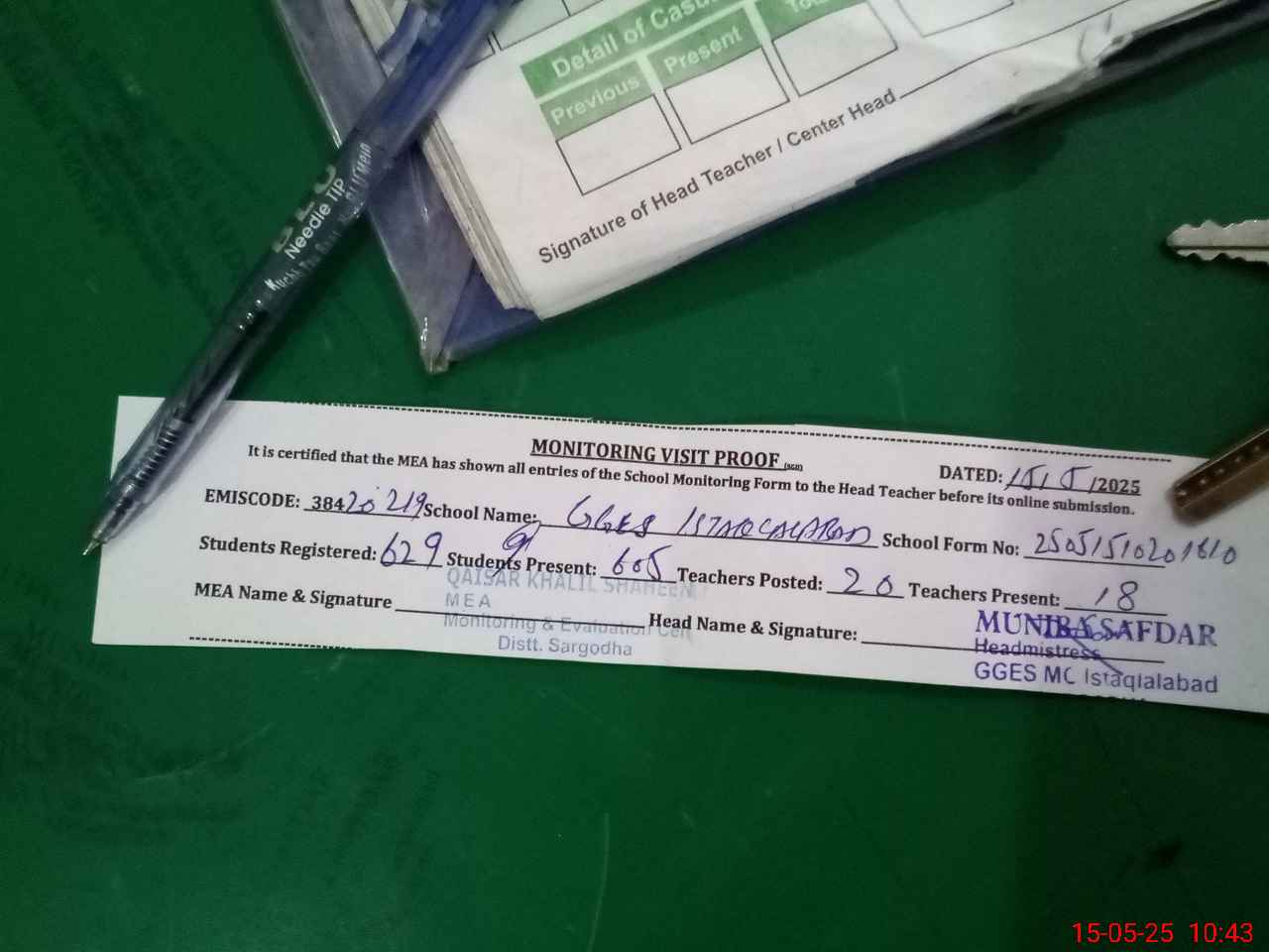 | Attendance Register | Head Teacher | MEA with School | Visit Proof |