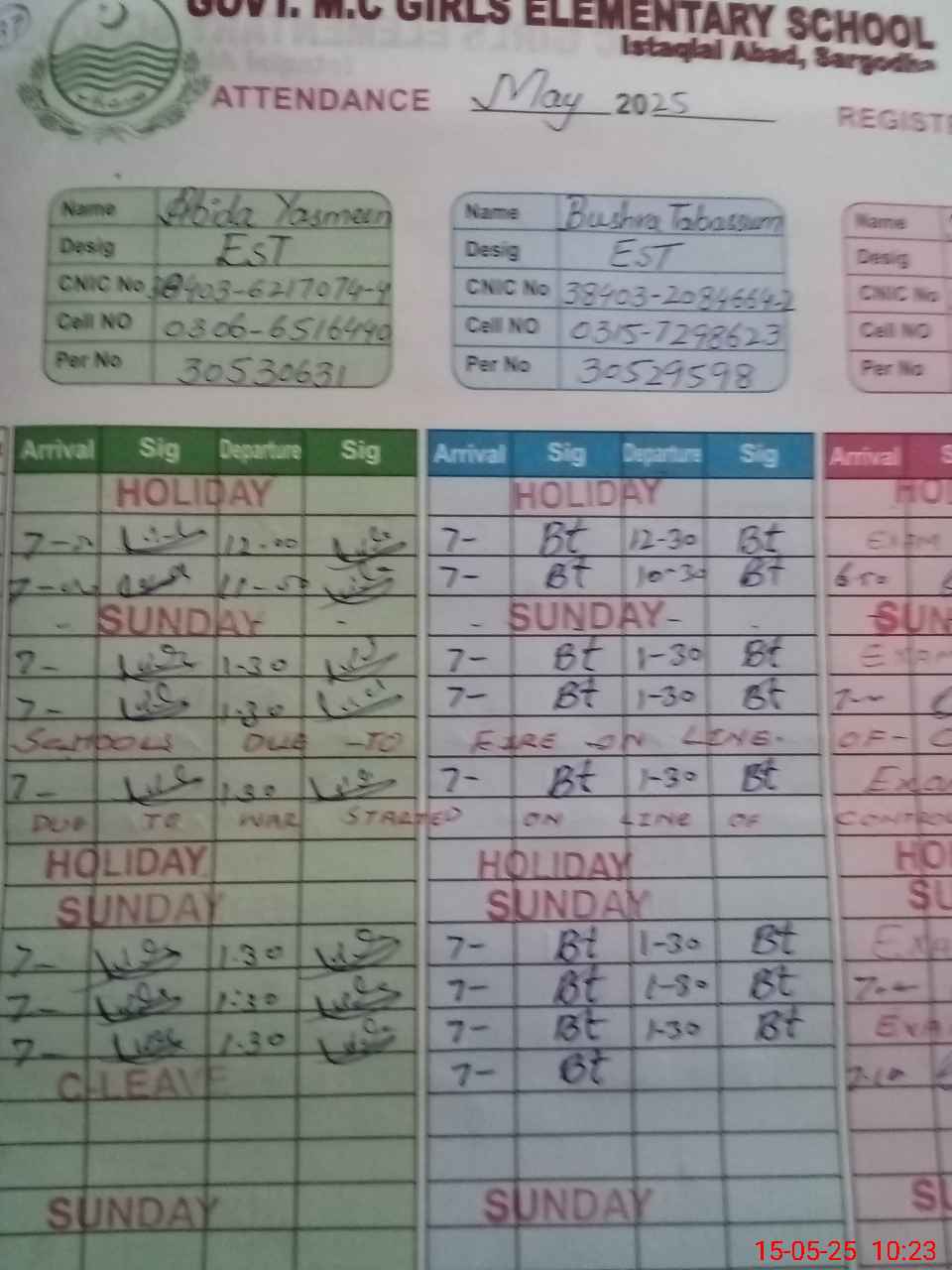 | CNIC | Full Name | Designation | R/C | Absence During Last Calender Month |