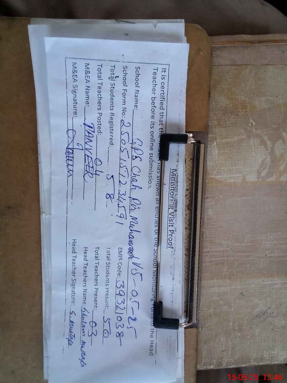 | Attendance Register | Head Teacher | MEA with School | Visit Proof |