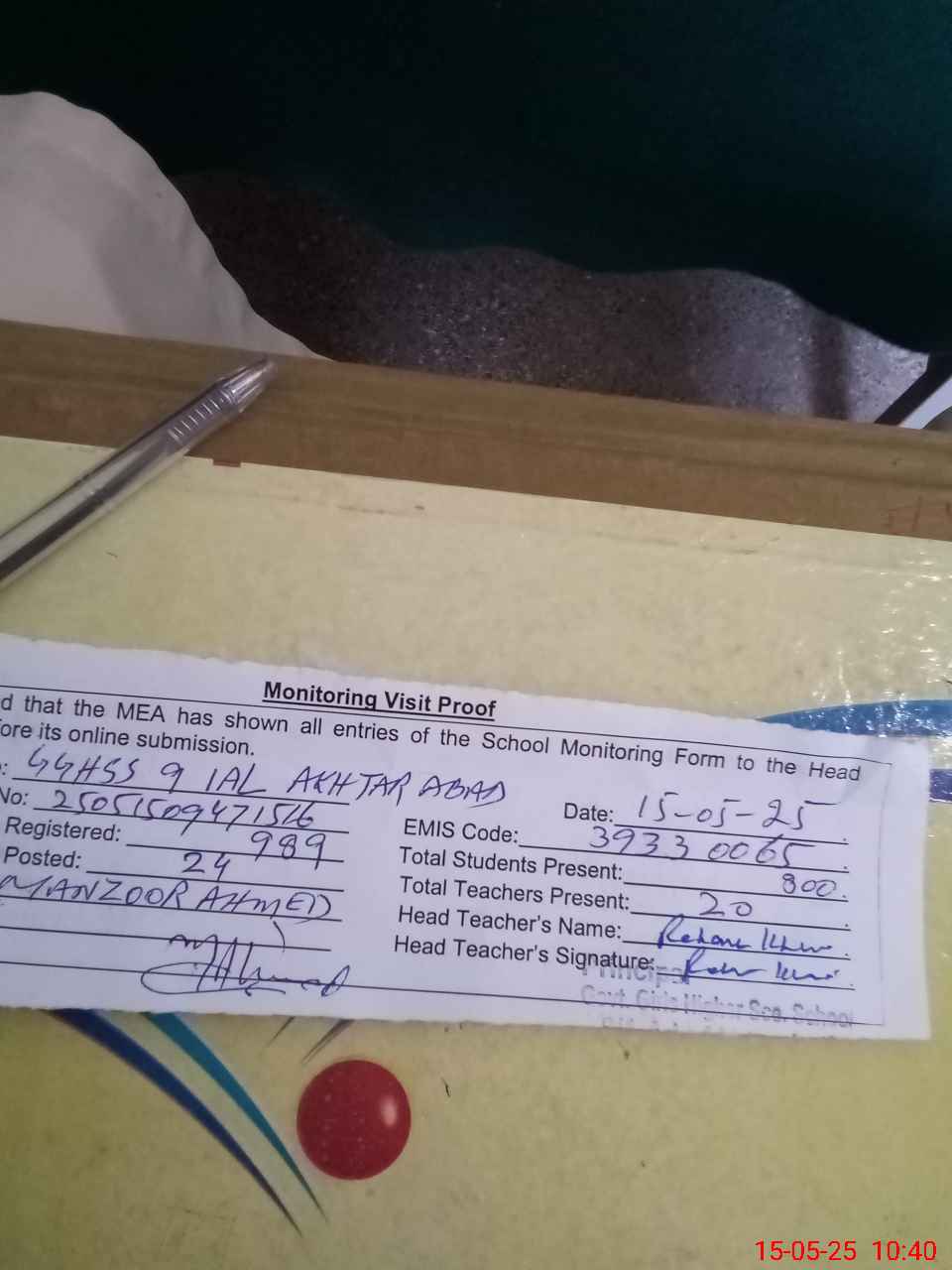 | Attendance Register | Head Teacher | MEA with School | Visit Proof |