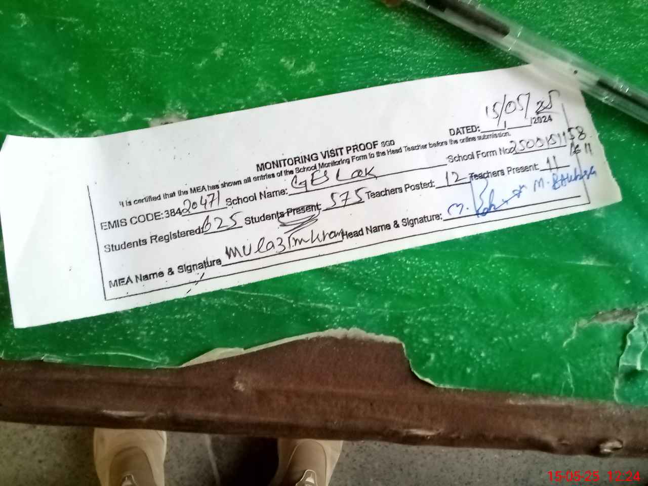| Attendance Register | Head Teacher | MEA with School | Visit Proof |
