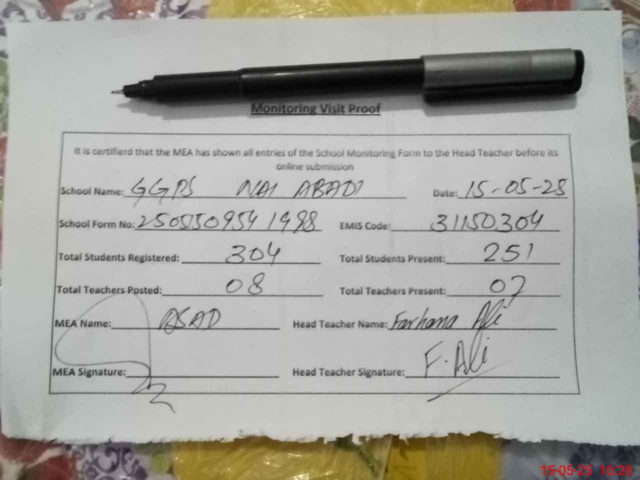 | Attendance Register | Head Teacher | MEA with School | Visit Proof |
