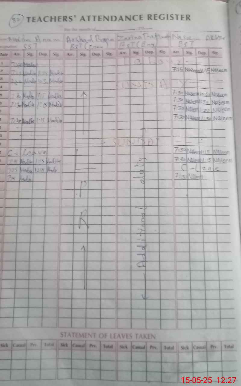 | CNIC | Full Name | Designation | R/C | Absence During Last Calender Month |