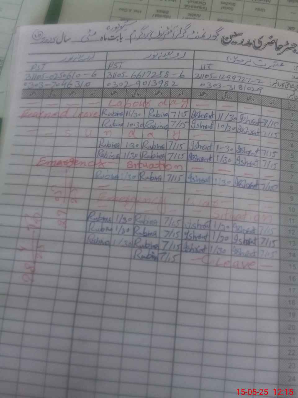 | CNIC | Full Name | Designation | R/C | Absence During Last Calender Month |
