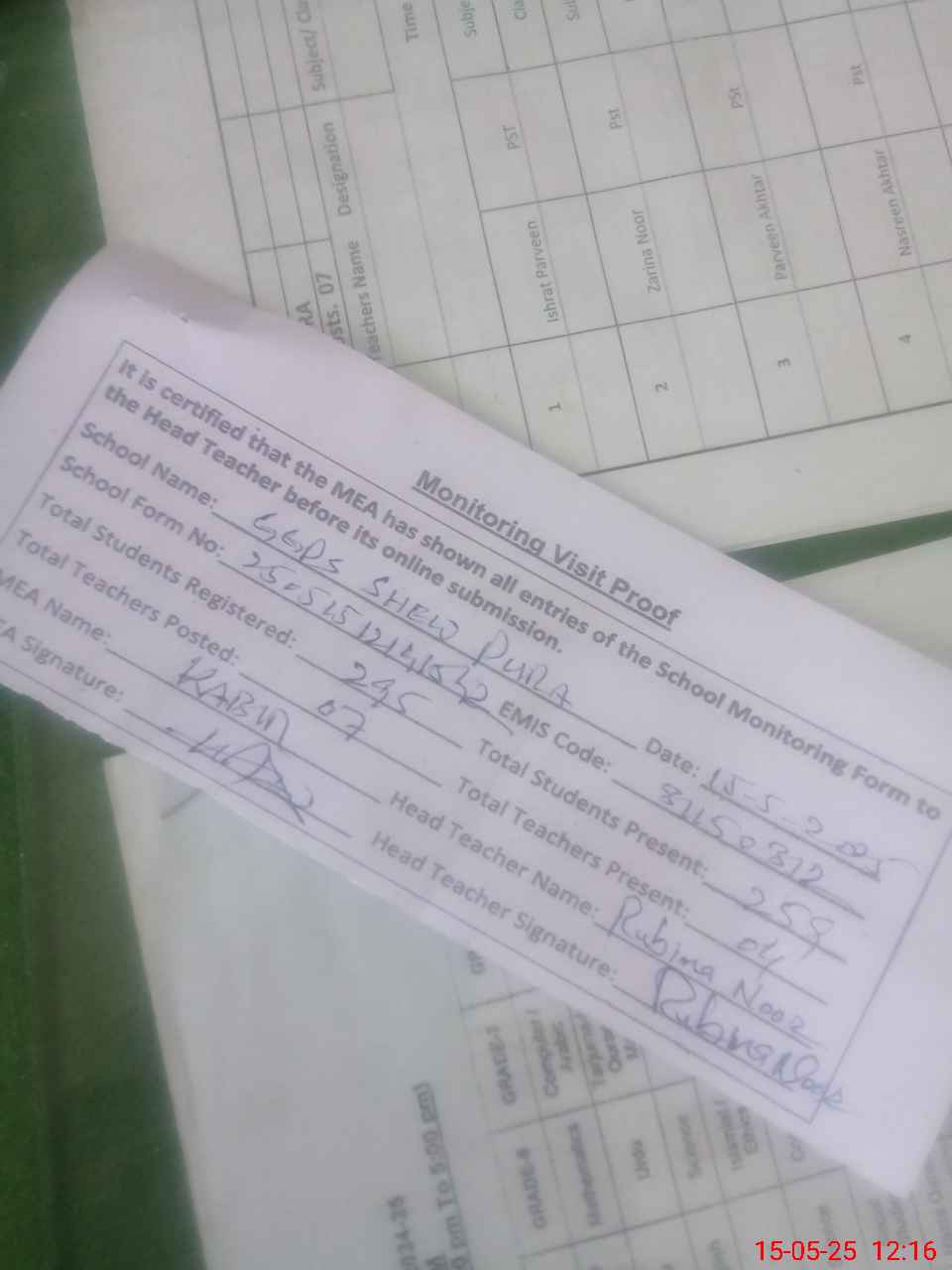 | Attendance Register | Head Teacher | MEA with School | Visit Proof |