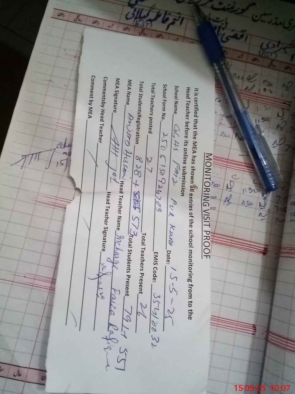 | Attendance Register | Head Teacher | MEA with School | Visit Proof |
