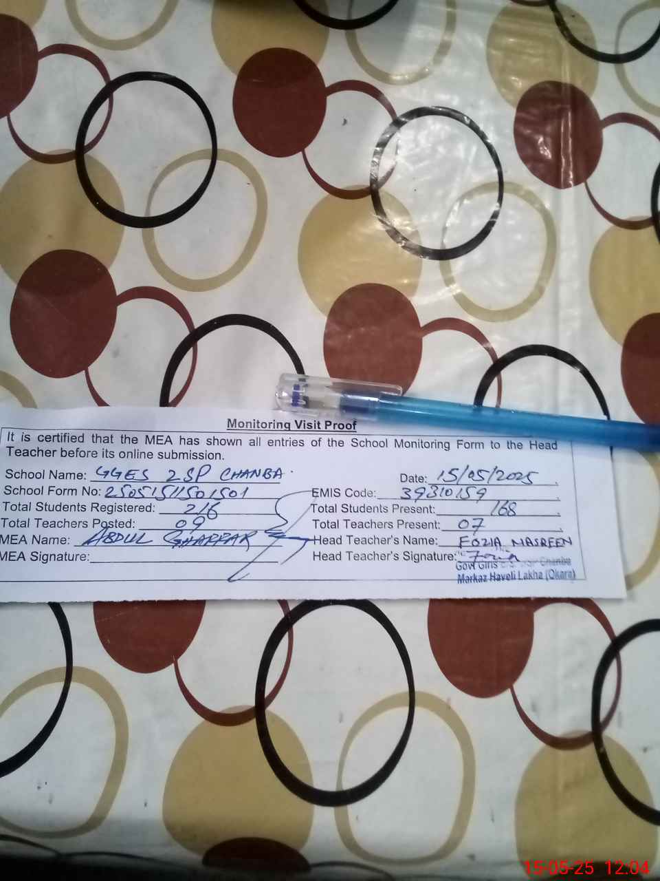 | Certified that this School was Inspected by the Undersigned MEA/DMO Today and the Information Stated Above is as Per Record. | |||||