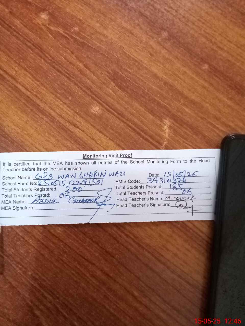 | EMIS Code: 39310374 | Name of School: GPS WAN SHERIN WALI | |||