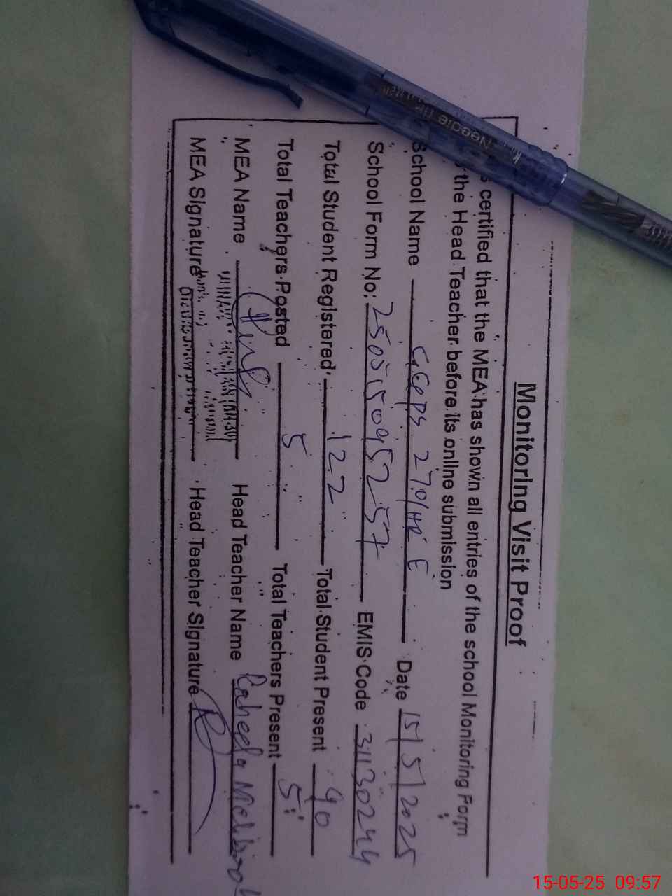 | Attendance Register | Head Teacher | MEA with School | Visit Proof |
