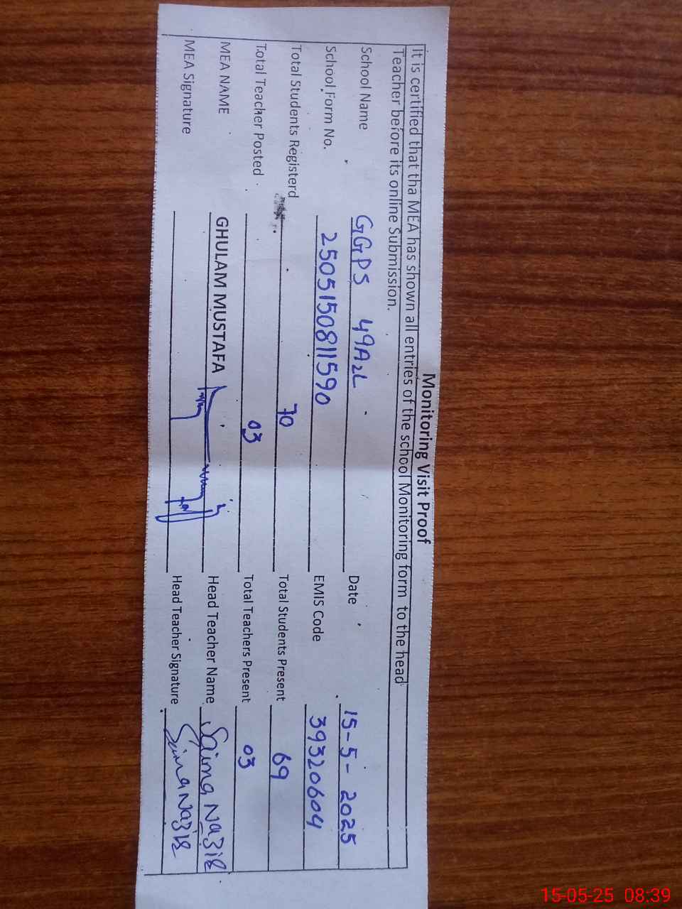 | Attendance Register | Head Teacher | MEA with School | Visit Proof |