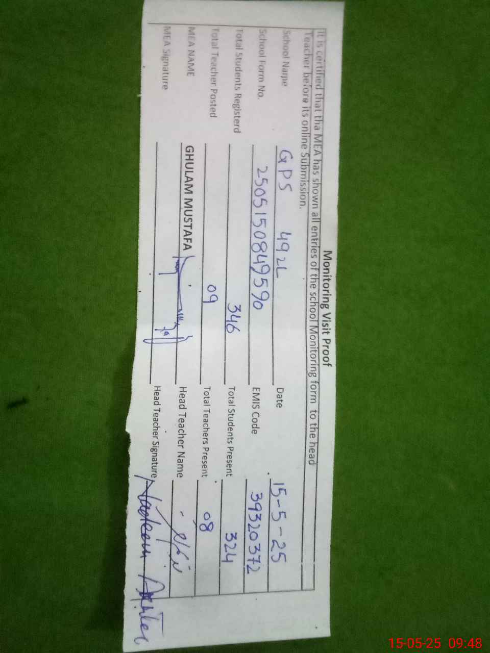 | Certified that this School was Inspected by the Undersigned MEA/DMO Today and the Information Stated Above is as Per Record. | |||||
