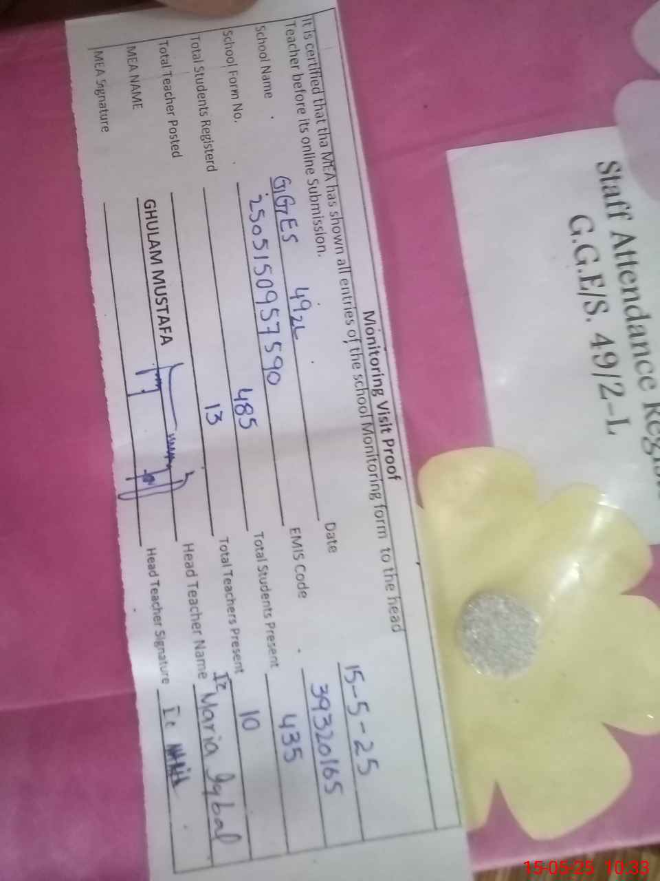 | Attendance Register | Head Teacher | MEA with School | Visit Proof |