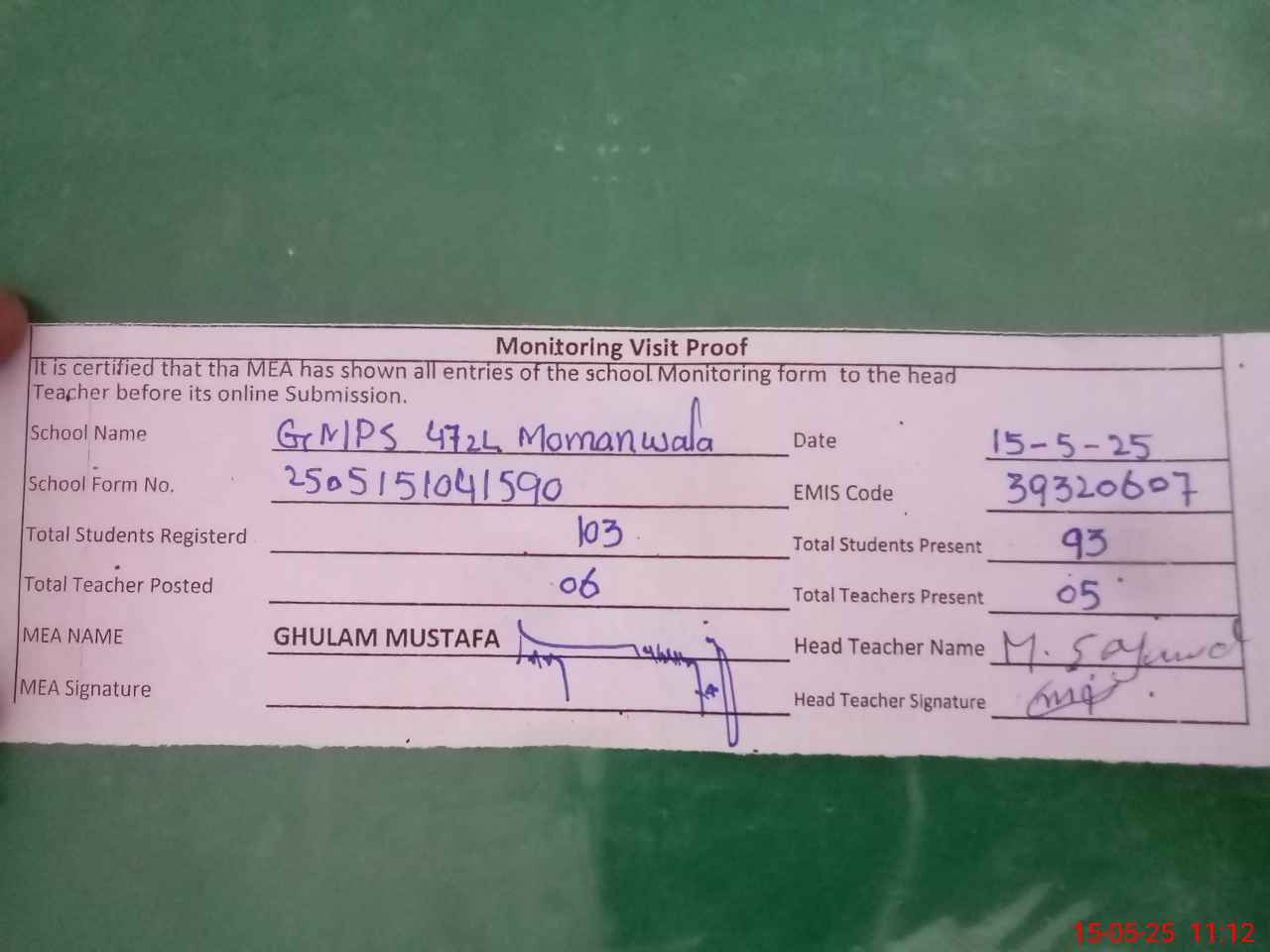 | Attendance Register | Head Teacher | MEA with School | Visit Proof |