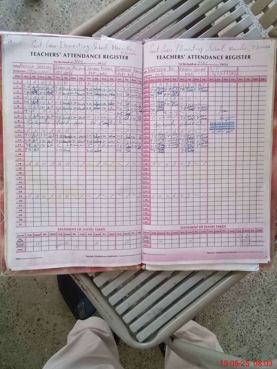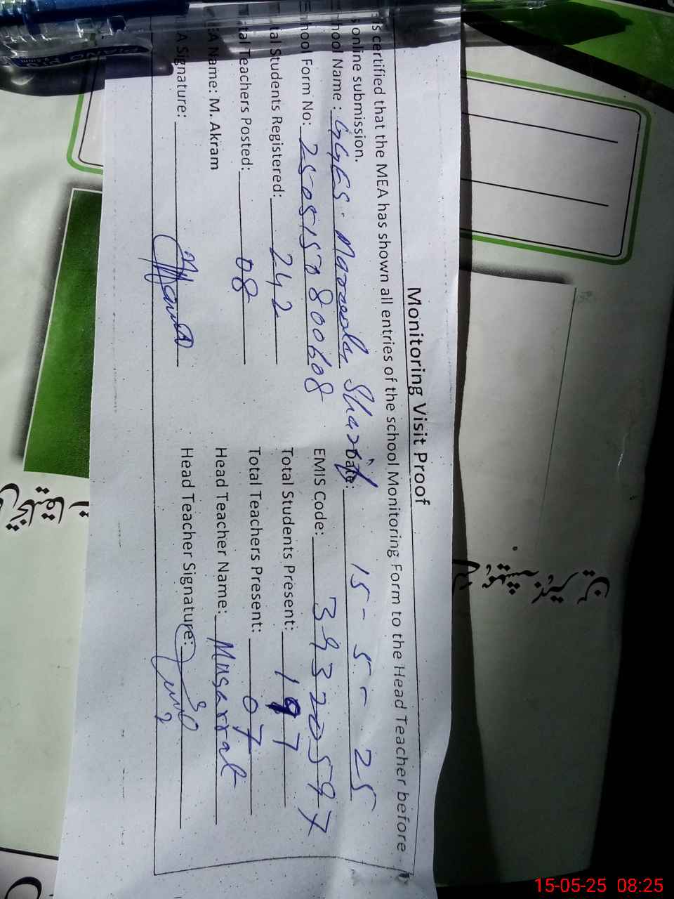 | Attendance Register | Head Teacher | MEA with School | Visit Proof |