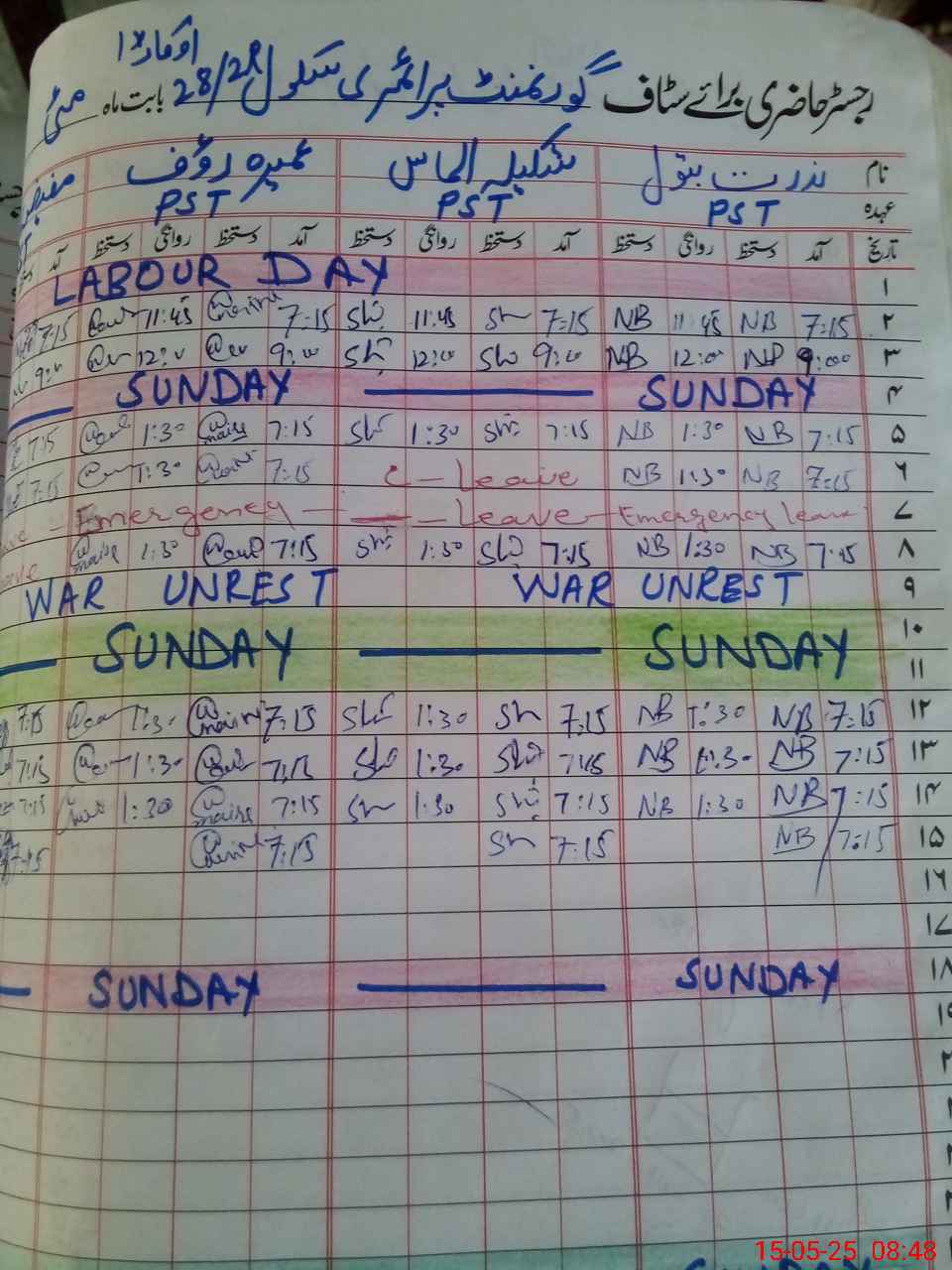 | CNIC | Full Name | Designation | R/C | Absence During Last Calender Month |