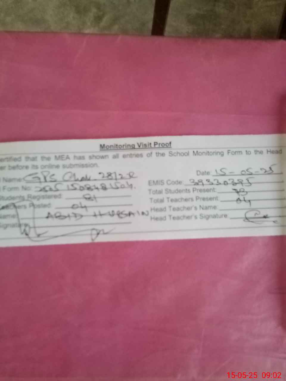 | Attendance Register | Head Teacher | MEA with School | Visit Proof |