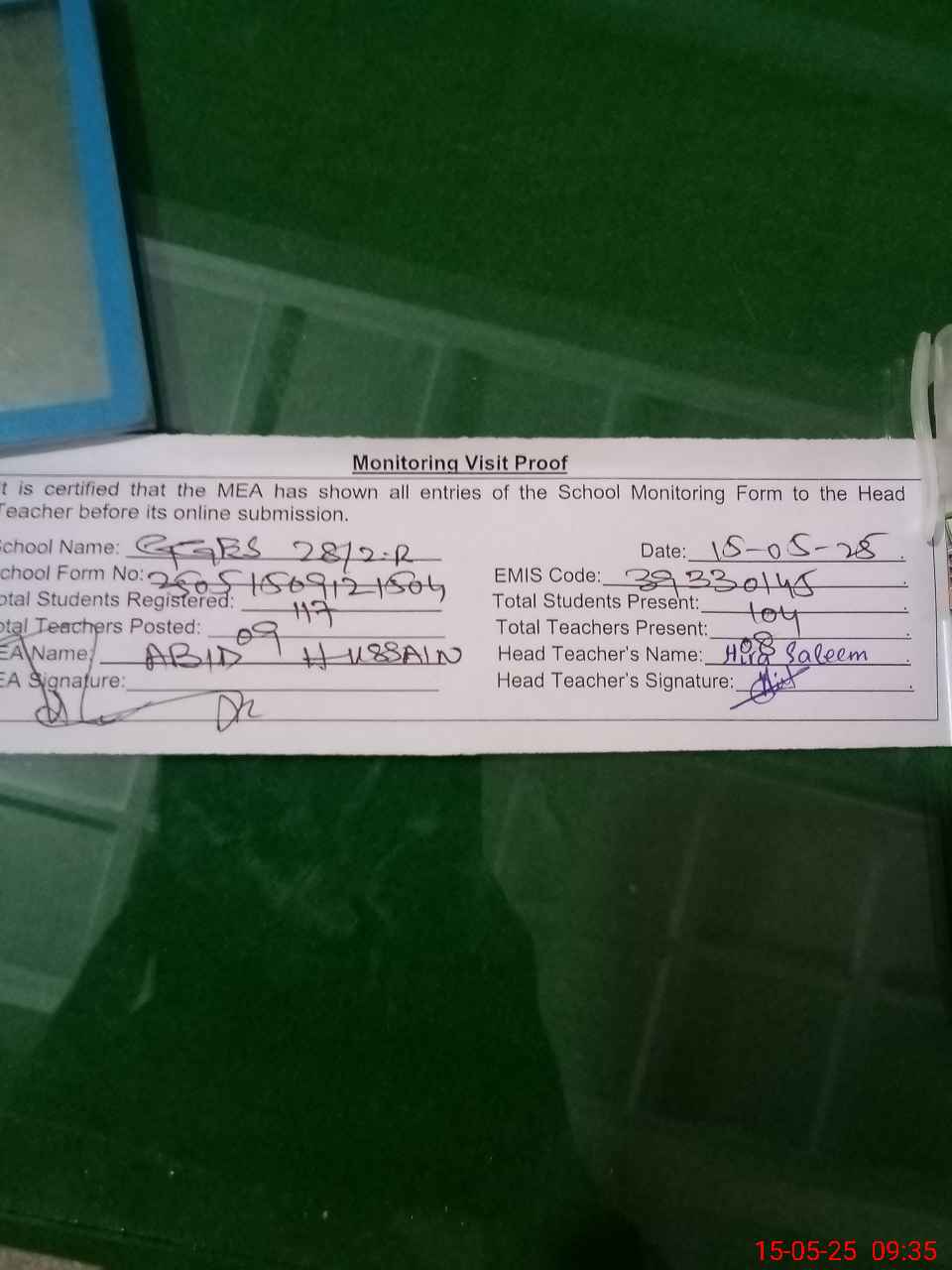 | Attendance Register | Head Teacher | MEA with School | Visit Proof |