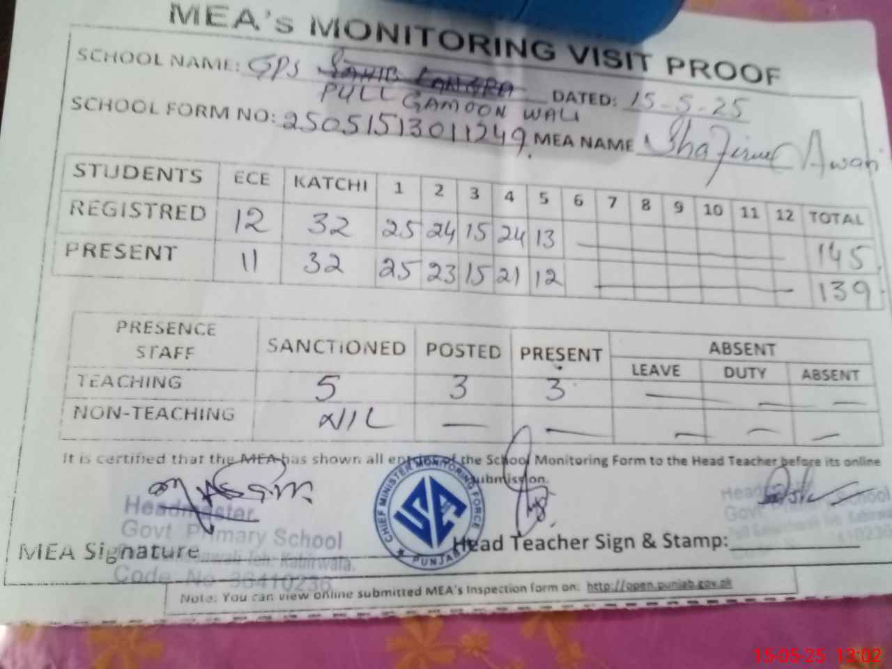| Attendance Register | Head Teacher | MEA with School | Visit Proof |