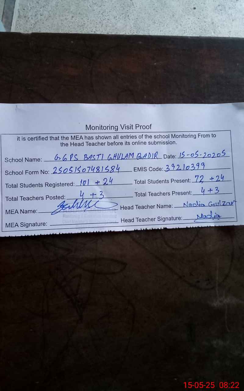 | EMIS Code: 39210399 | Name of School: GGPS BASTI GHULAM QADIR | |||