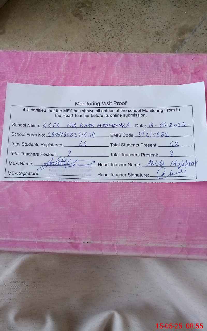 | EMIS Code: 39210582 | Name of School: GGPS MIR KHAN MAHMOONKA | |||