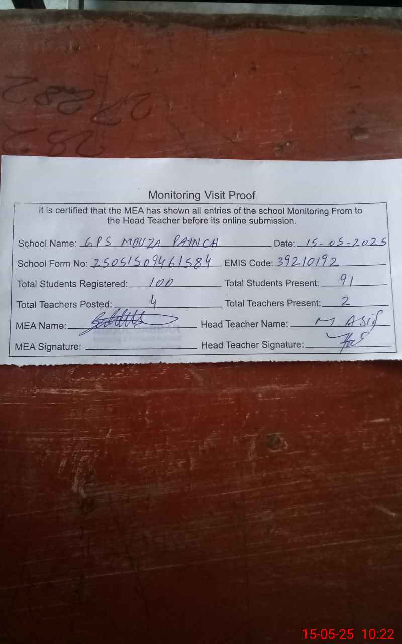 | EMIS Code: 39210192 | Name of School: GPS MOUZA PAINCH PO PAKPATTAN | |||