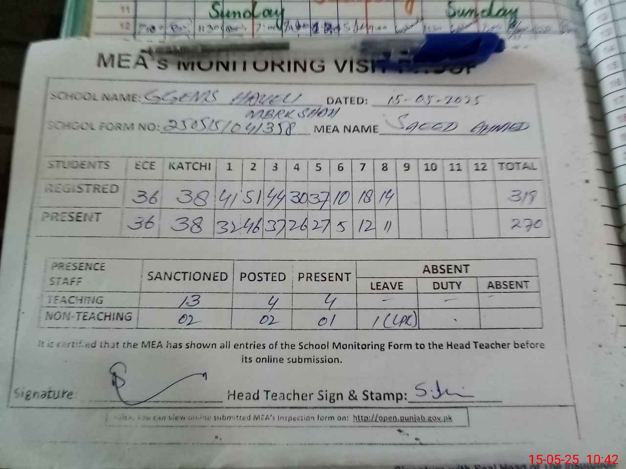 | Attendance Register | Head Teacher | MEA with School | Visit Proof |