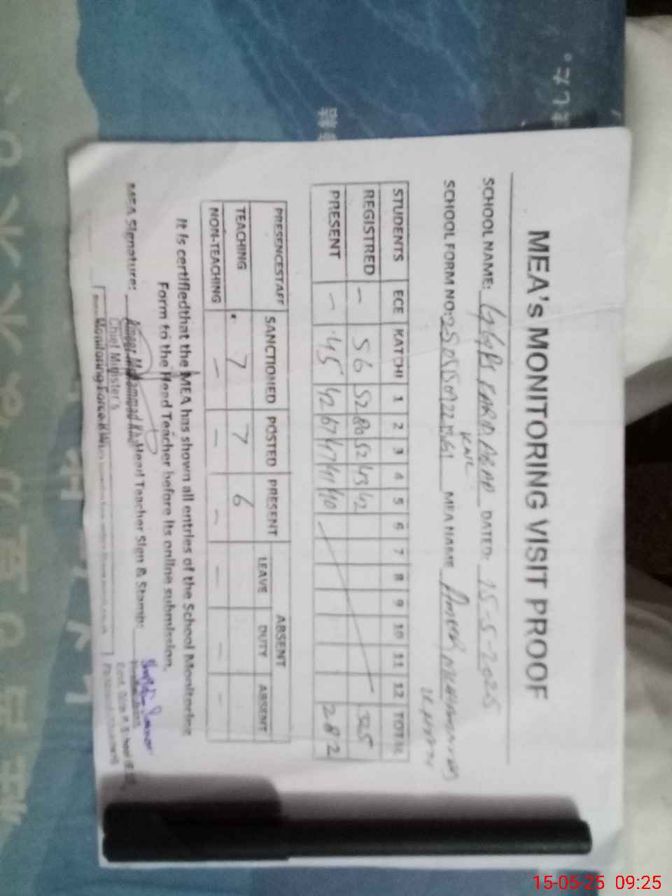 | Attendance Register | Head Teacher | MEA with School | Visit Proof |