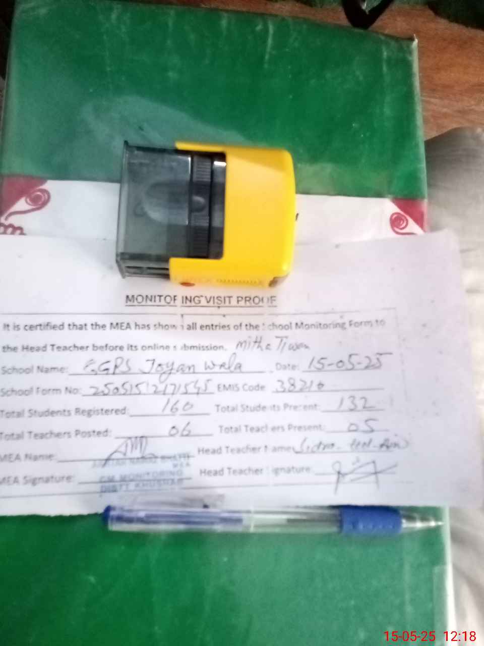 | EMIS Code: 38210782 | Name of School: GGPS JOIYAN WALA | |||