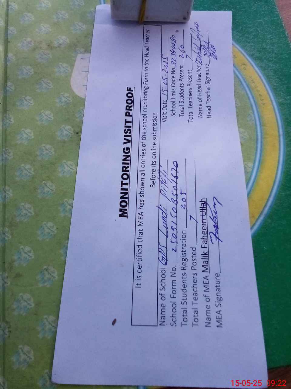 | Attendance Register | Head Teacher | MEA with School | Visit Proof |