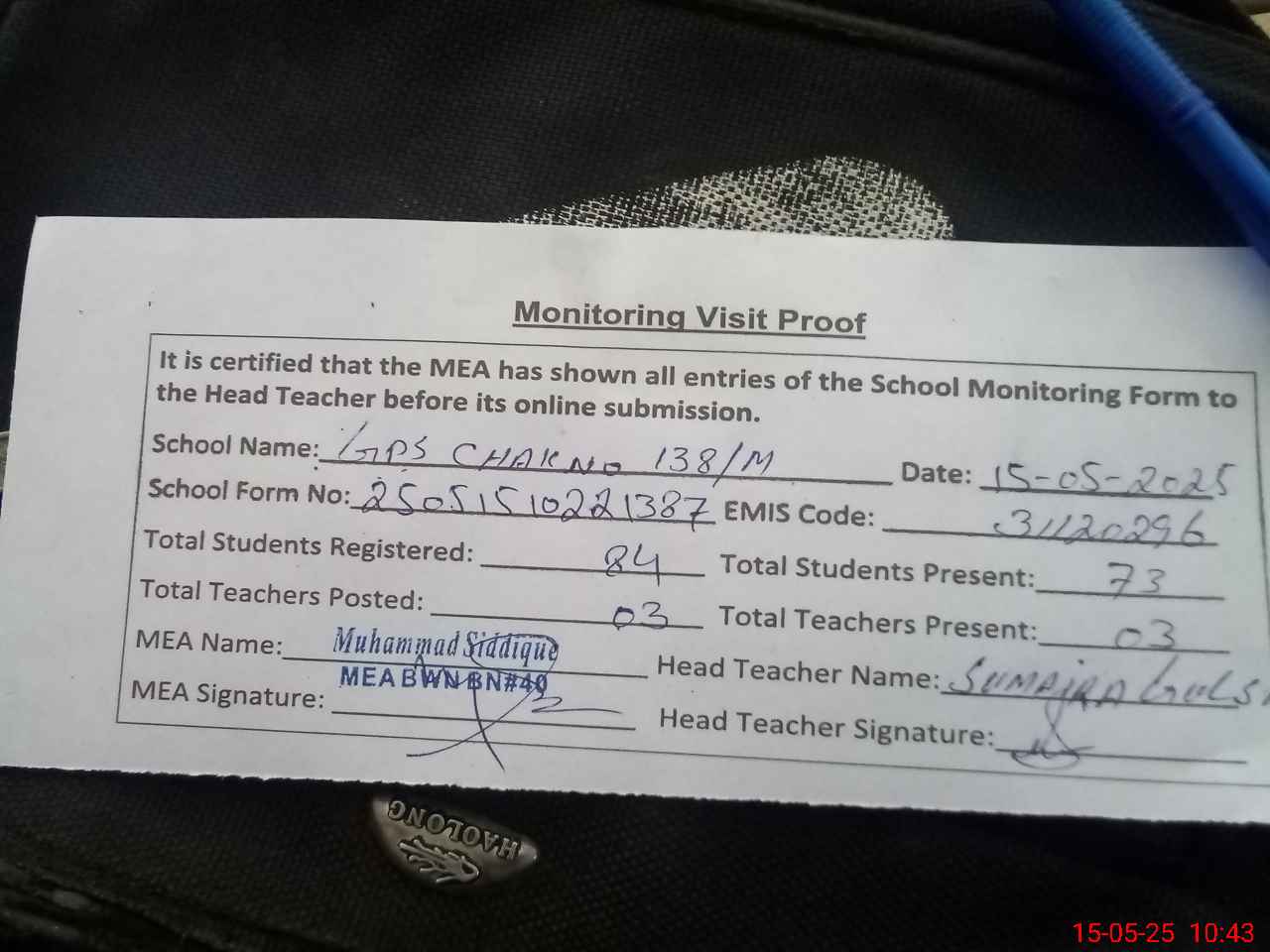 | EMIS Code: 31120296 | Name of School: GPS CHAK NO 138 M | |||