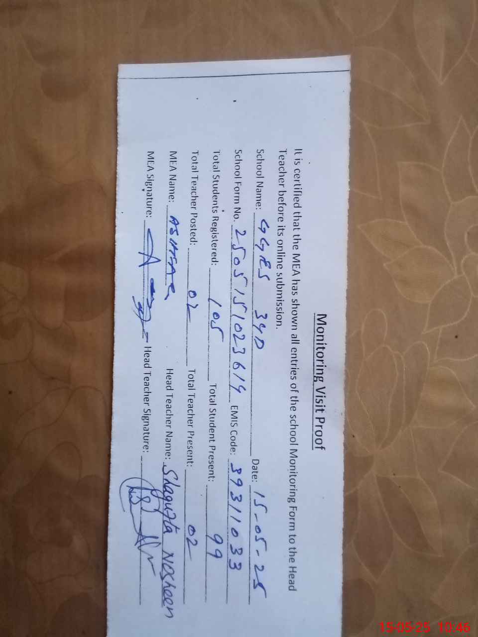 | Attendance Register | Head Teacher | MEA with School | Visit Proof |
