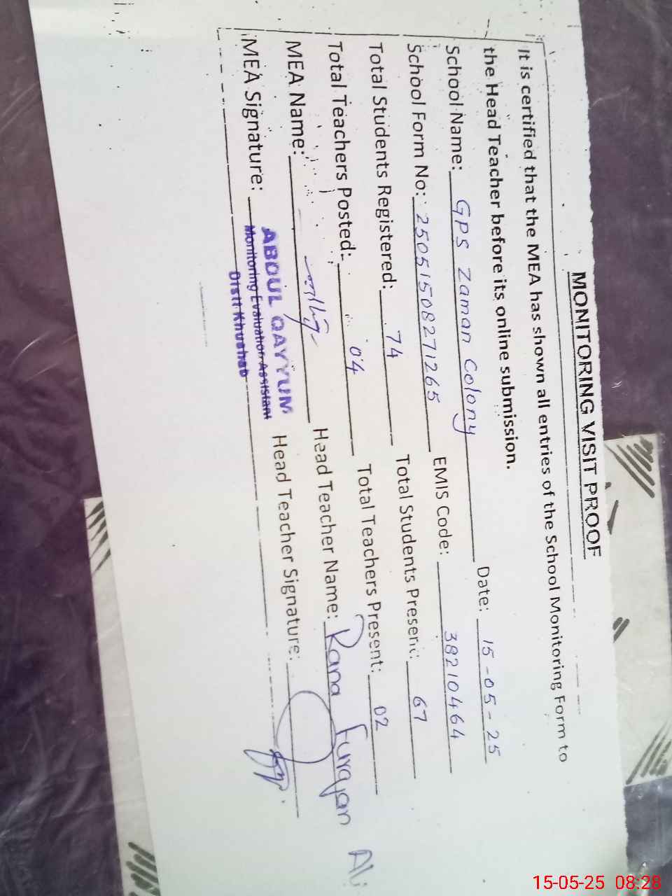 | Attendance Register | Head Teacher | MEA with School | Visit Proof |