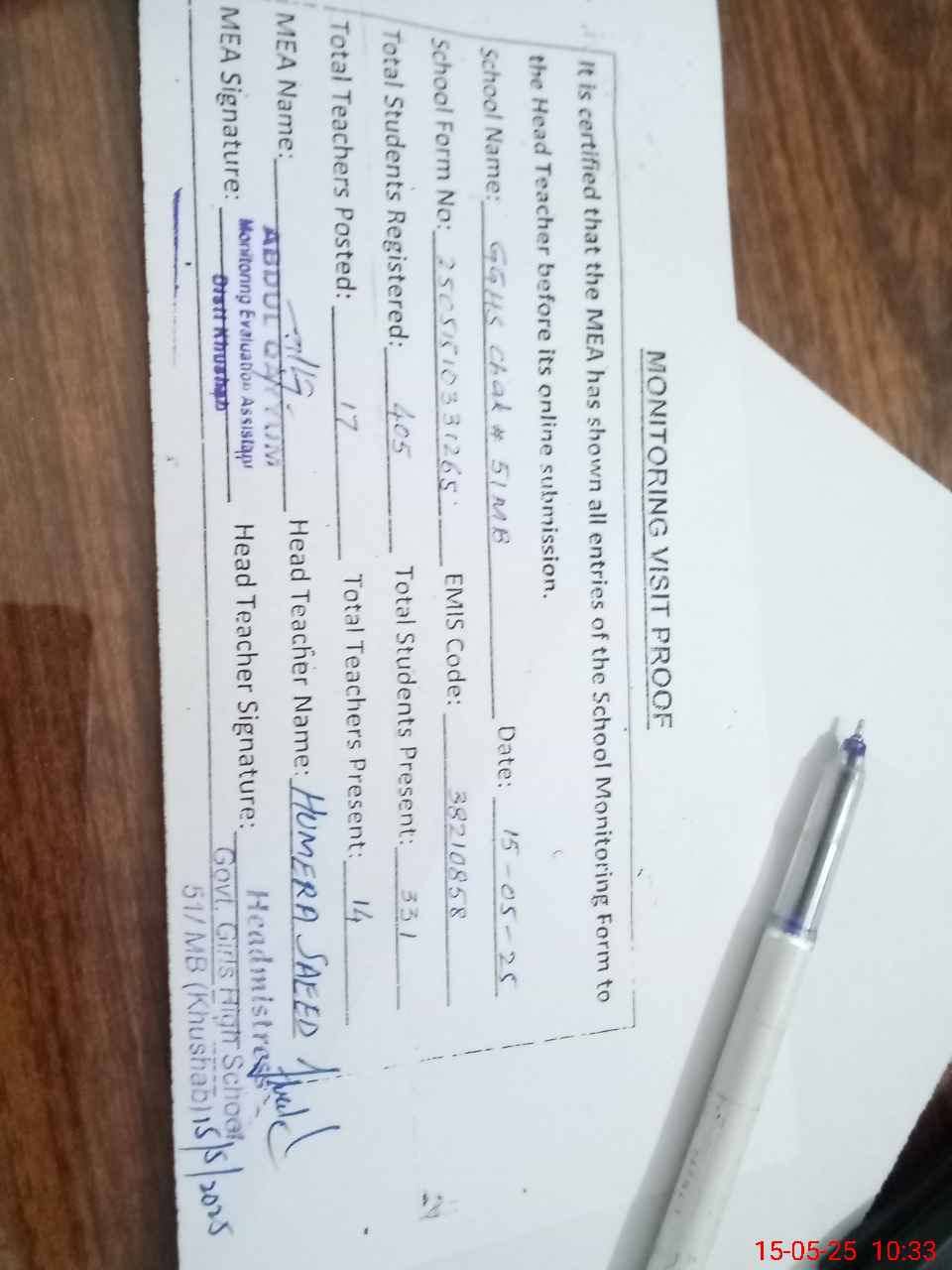 | Attendance Register | Head Teacher | MEA with School | Visit Proof |
