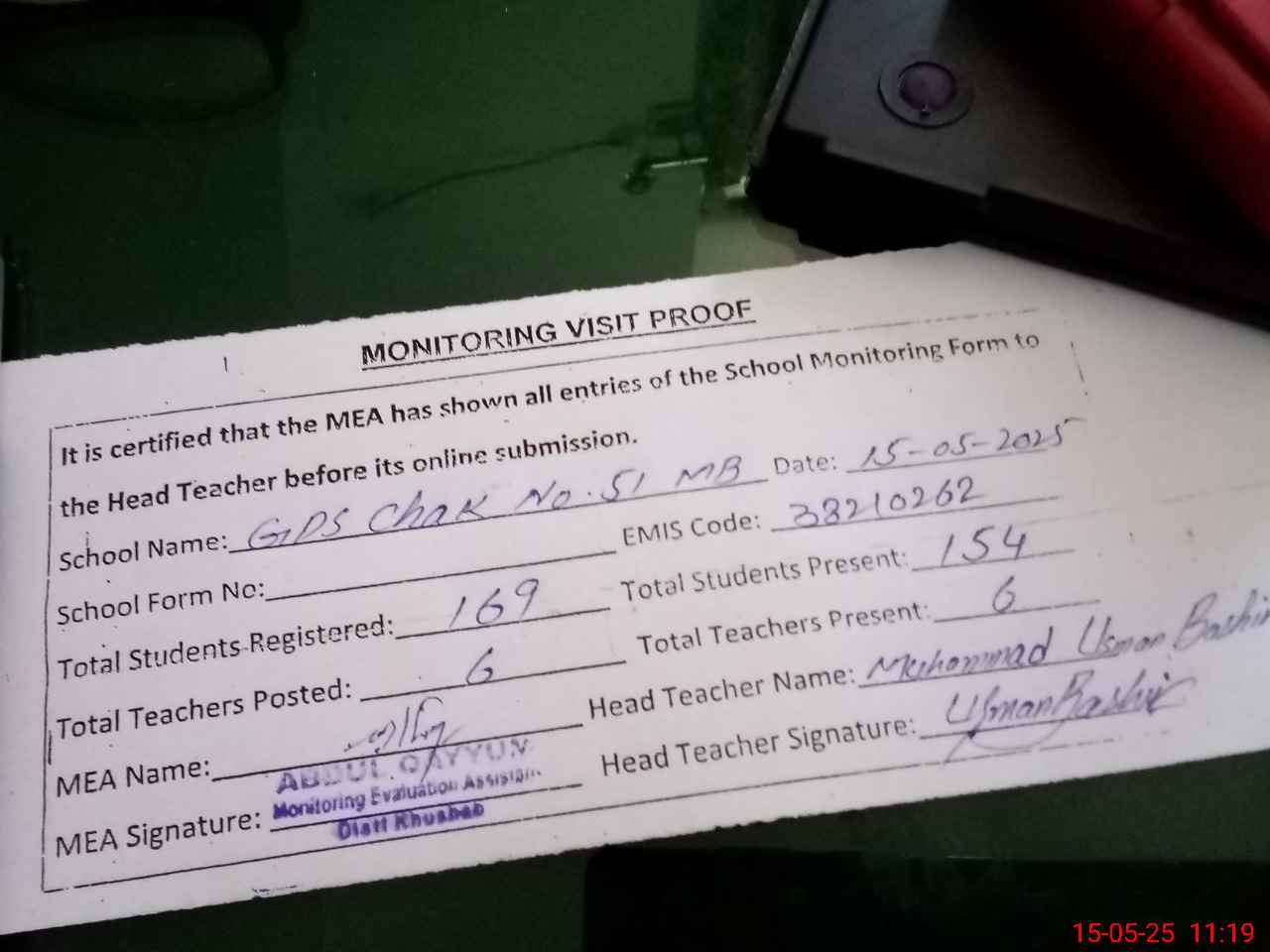 | Certified that this School was Inspected by the Undersigned MEA/DMO Today and the Information Stated Above is as Per Record. | |||||