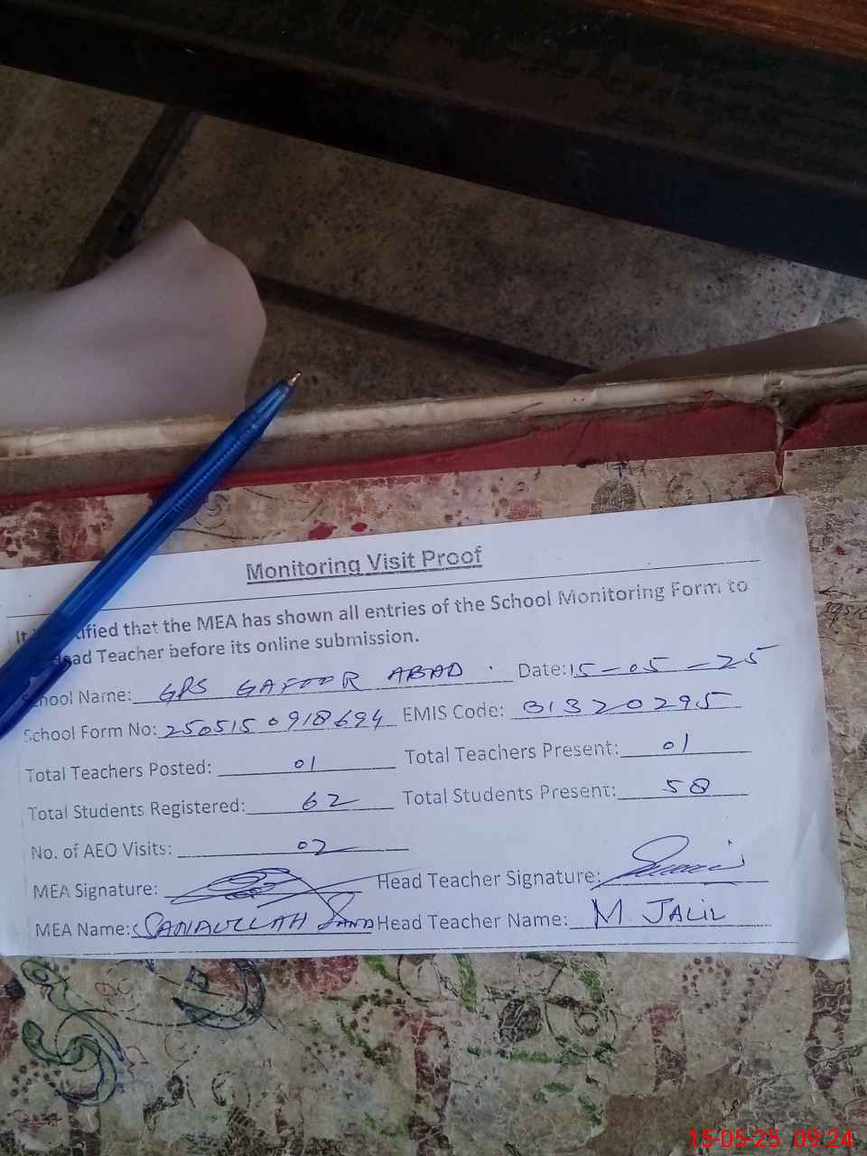 | Attendance Register | Head Teacher | MEA with School | Visit Proof |