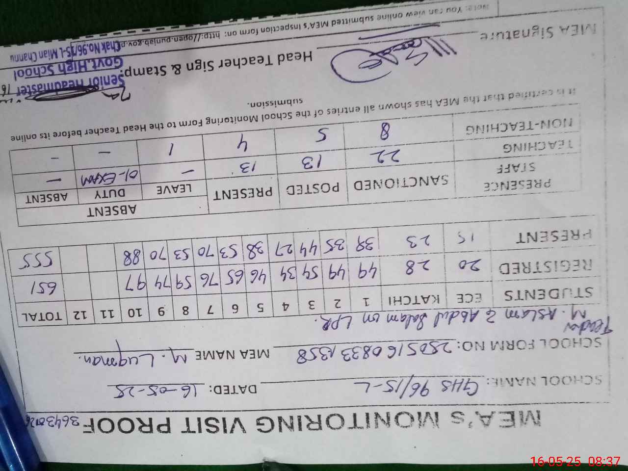 | Attendance Register | Head Teacher | MEA with School | Visit Proof |