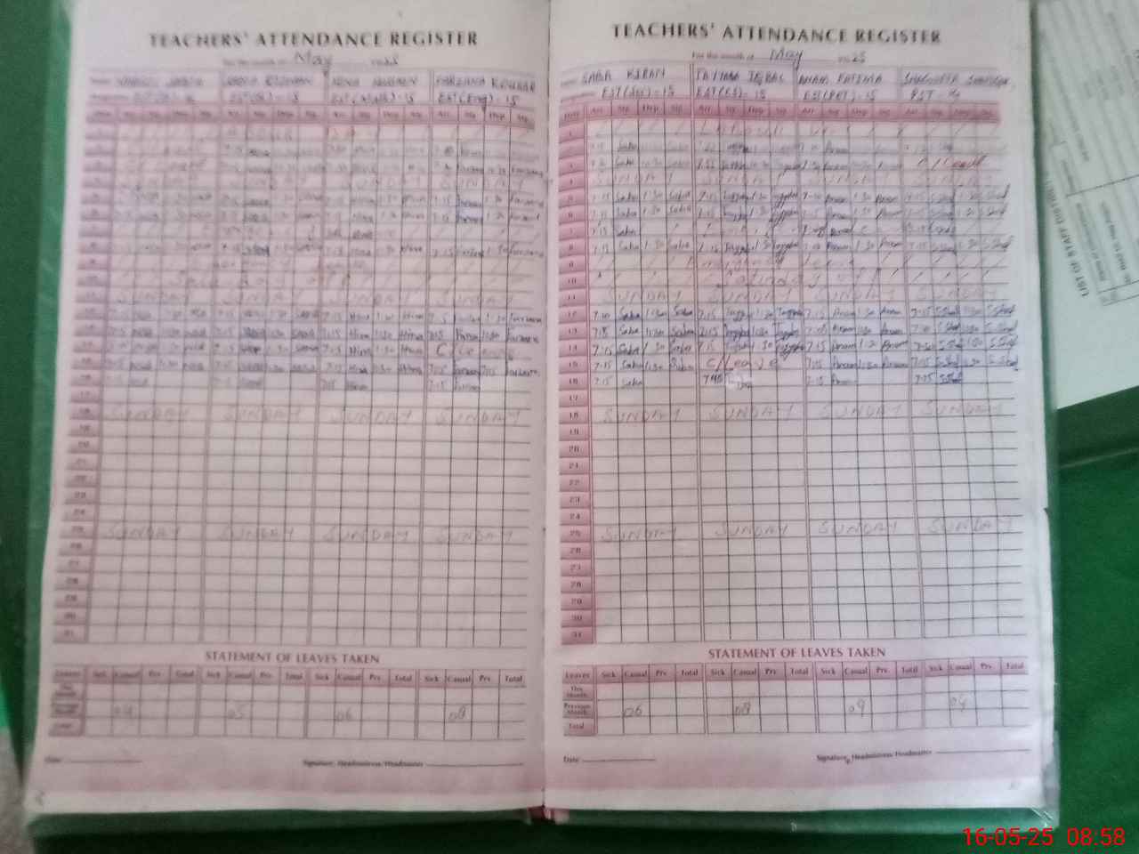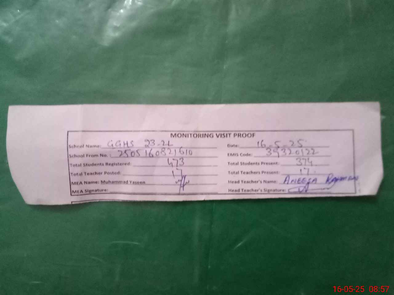 | Attendance Register | Head Teacher | MEA with School | Visit Proof |