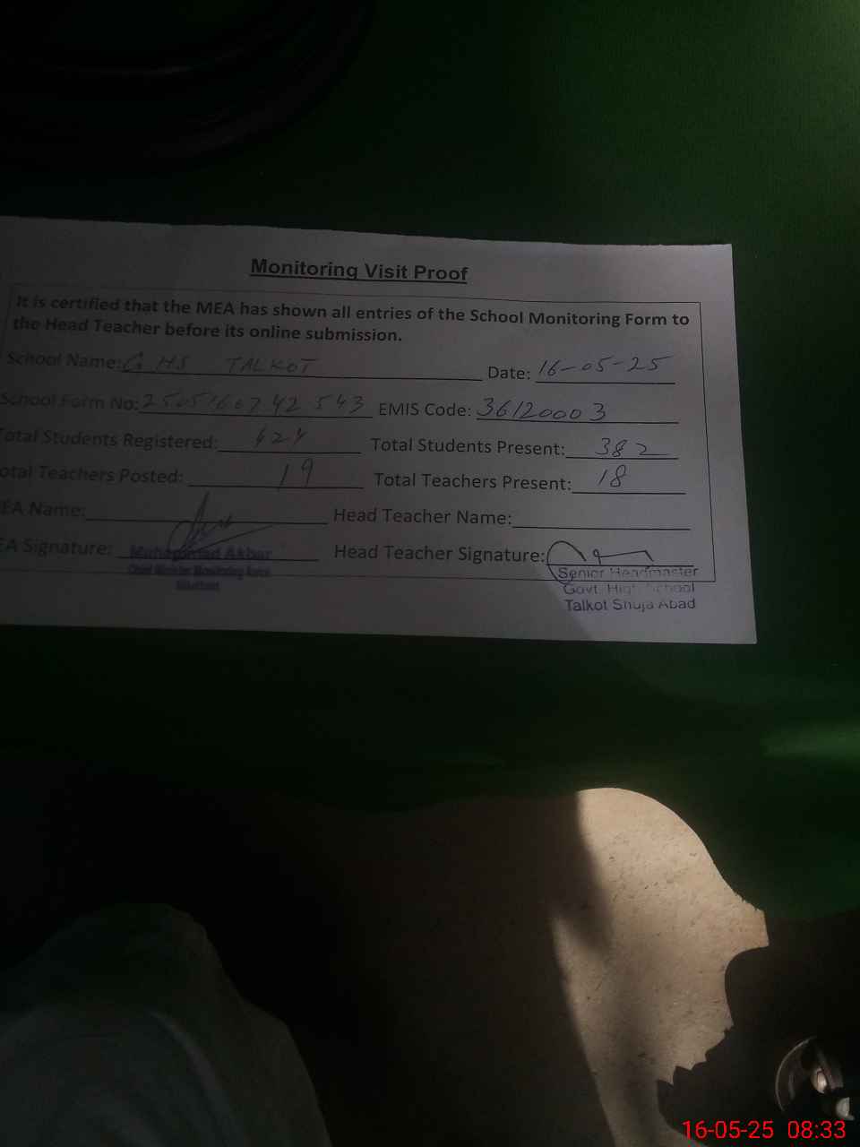 | Attendance Register | Head Teacher | MEA with School | Visit Proof |