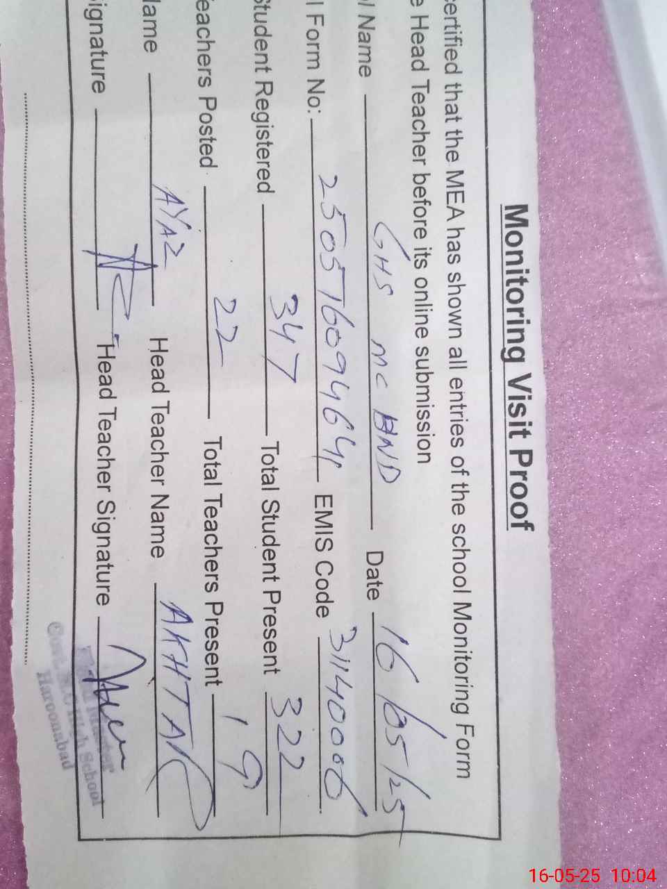 | Certified that this School was Inspected by the Undersigned MEA/DMO Today and the Information Stated Above is as Per Record. | |||||