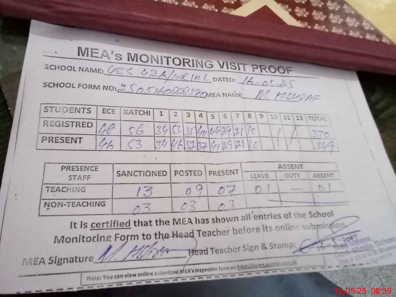 | Attendance Register | Head Teacher | MEA with School | Visit Proof |