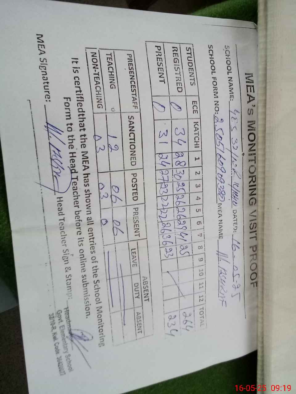 | Attendance Register | Head Teacher | MEA with School | Visit Proof |