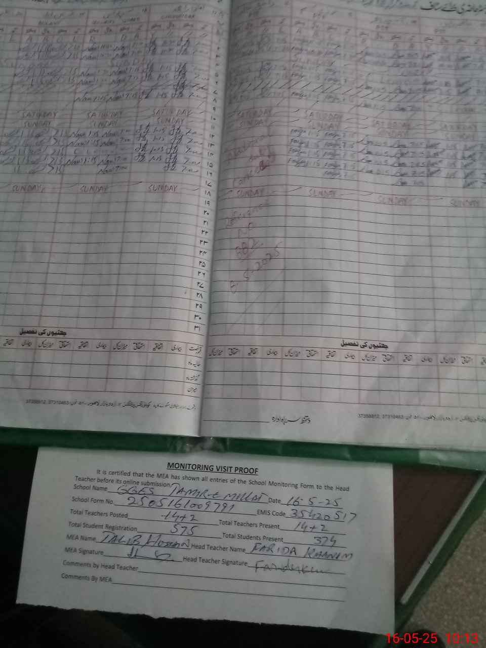 | Attendance Register | Head Teacher | MEA with School | Visit Proof |