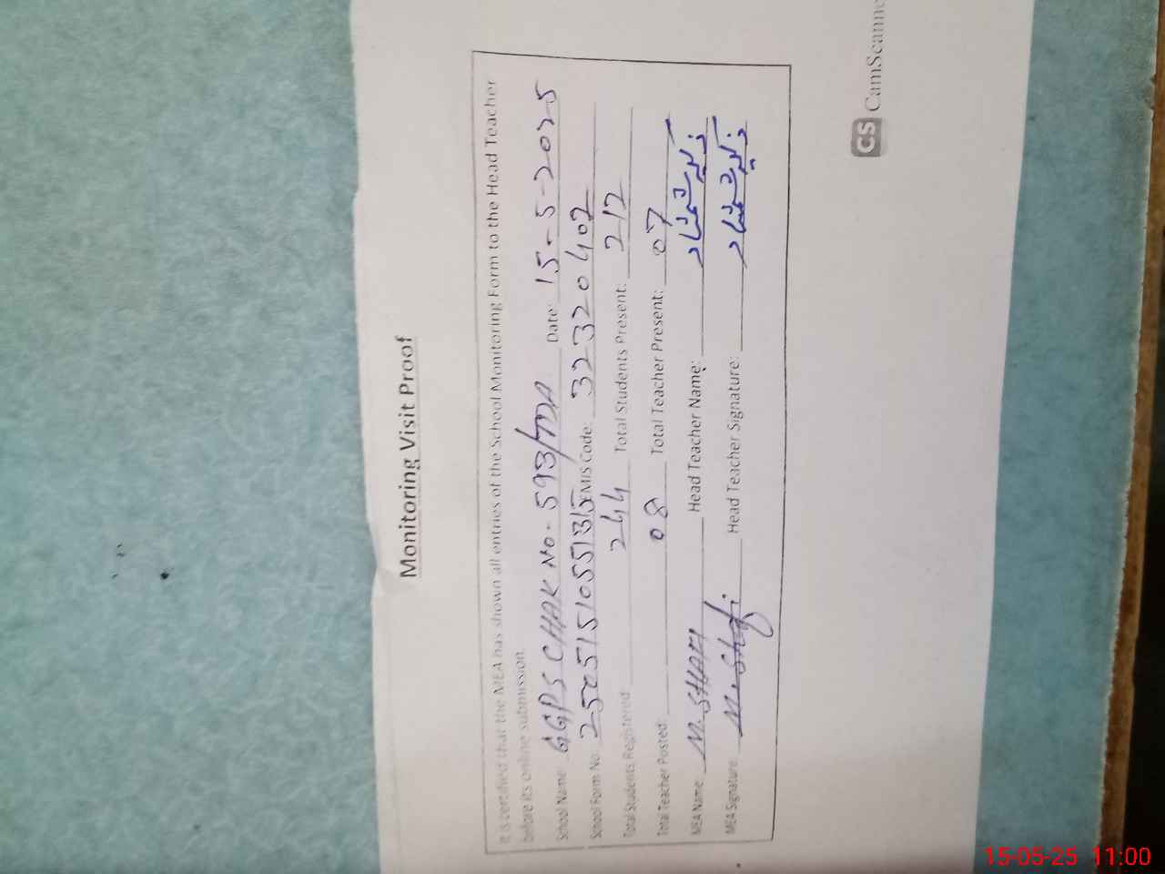| Attendance Register | Head Teacher | MEA with School | Visit Proof |