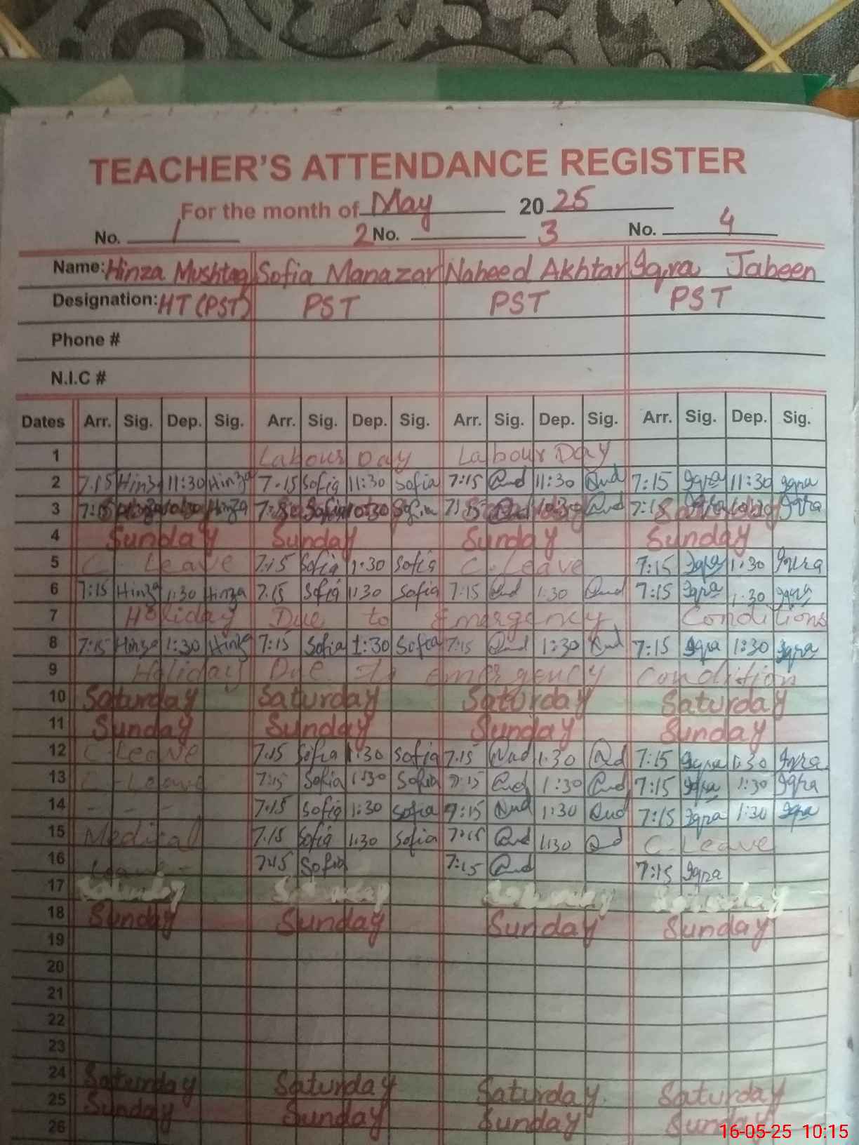 | CNIC | Full Name | Designation | R/C | Absence During Last Calender Month |