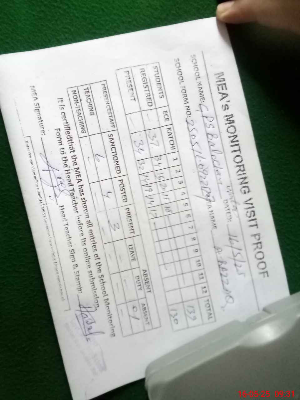 | Attendance Register | Head Teacher | MEA with School | Visit Proof |