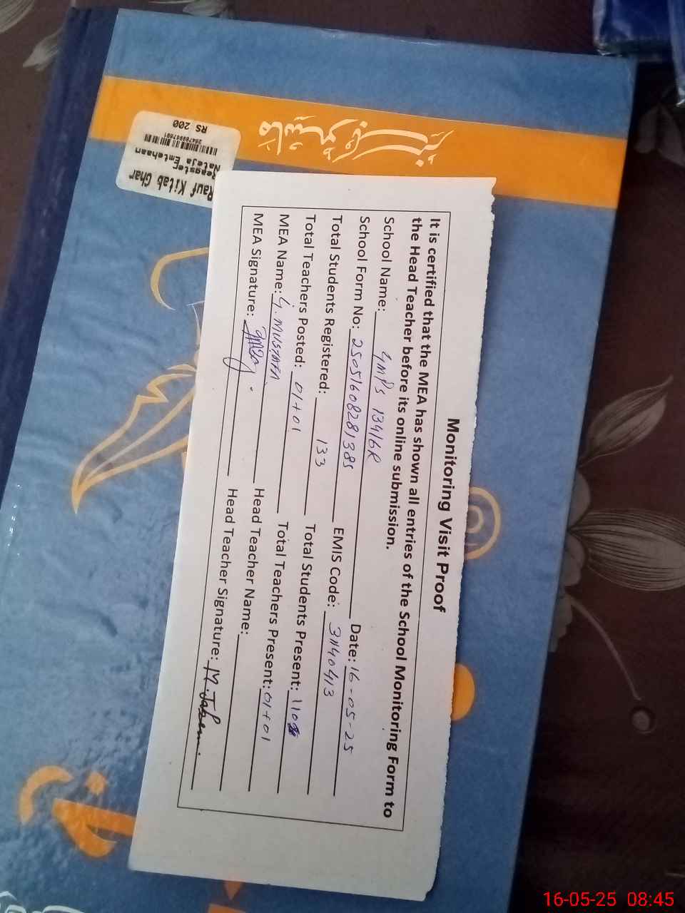 | Attendance Register | Head Teacher | MEA with School | Visit Proof |