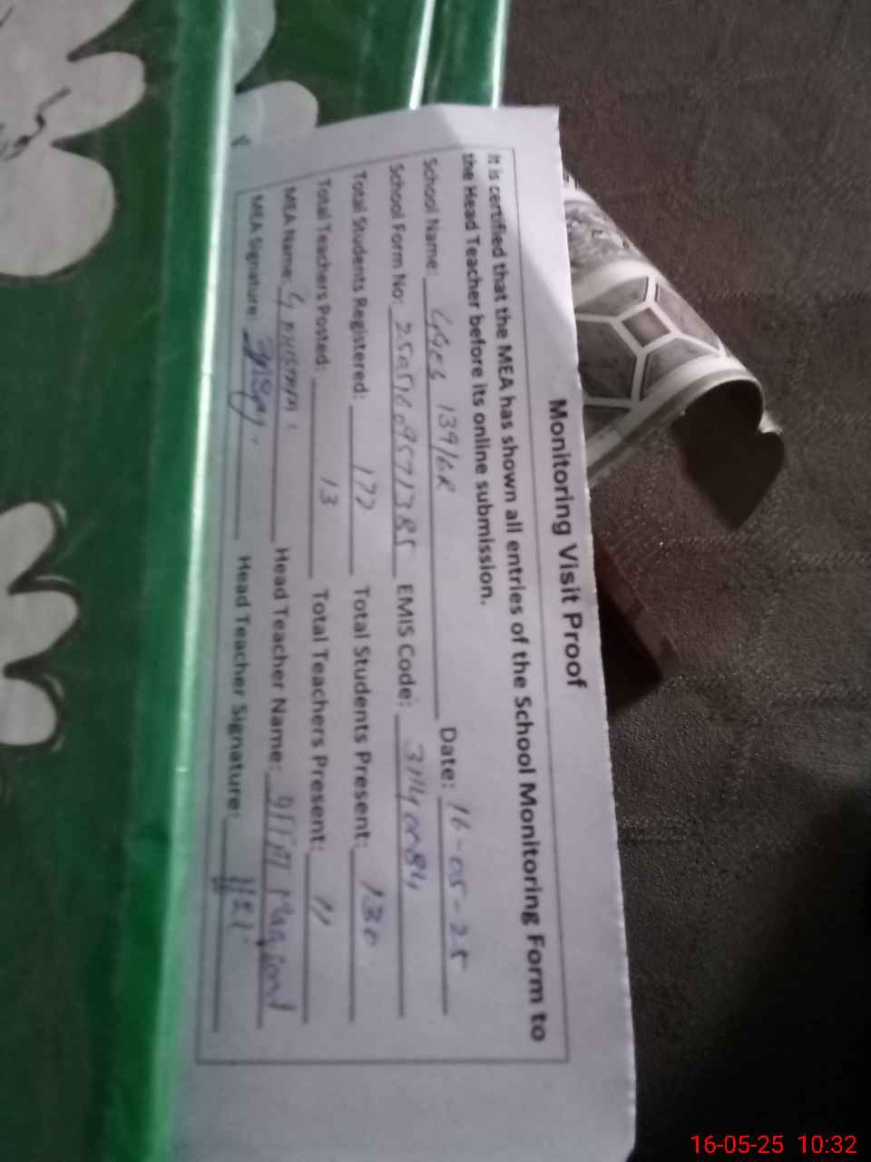 | Attendance Register | Head Teacher | MEA with School | Visit Proof |