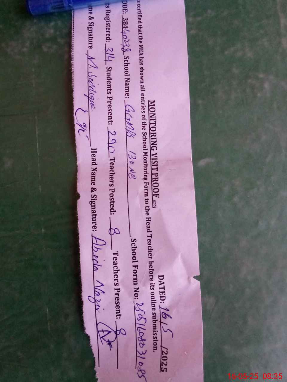 | Attendance Register | Head Teacher | MEA with School | Visit Proof |