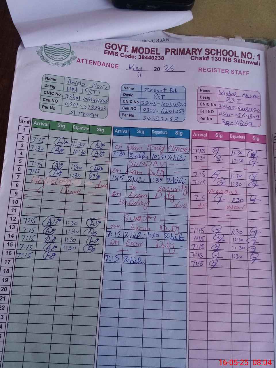 | CNIC | Full Name | Designation | R/C | Absence during last cal. month |